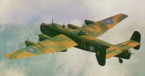 Een van de weinige kleurfoto’s van een Halifax II in vlucht